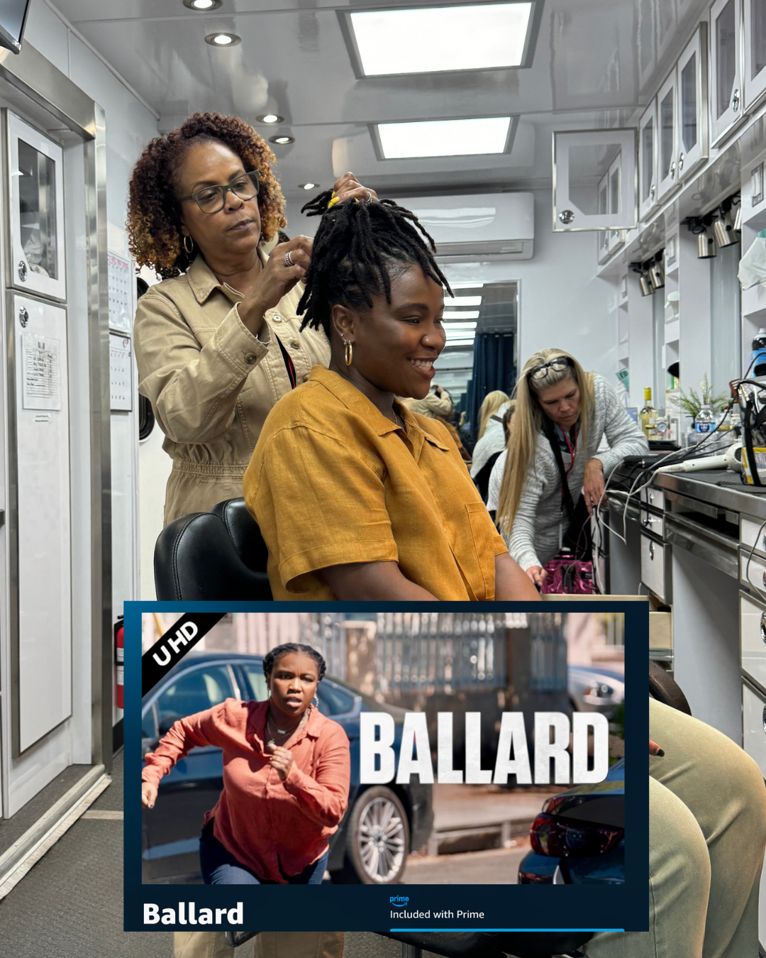 “When I was on the Ballard set, we used a brand heavily with my hair, my locs. It’s a woman named Lisa, who created her own products. The products are called My Curl Products. They are so good! She was the one that was doing a lot of my loc style on set. Her whole goal on set was to make sure my locs were taken care of—and it worked. They felt healthy, and they were moisturized.